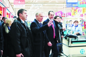 履新后首次访华的法国总理让-马克·埃罗(左二),昨日在其紧张的行程中不忘安排参观考察自家企业家乐福在中国的发展情况。昨日下午,他来到北京家乐福双井店,家乐福大中华区总裁唐嘉年(左三)全程陪同参观。据悉,埃罗本次率领了百人代表团,“经济合作”贯穿其本次访华5天行程。北京商报记者 刘玉飞/文 冯中豪/摄