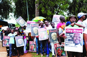 11日,在南非比勒陀利亚,民众在总统府联合大厦外等待瞻仰曼德拉遗容。南非前总统曼德拉遗体当日运抵南非行政首都比勒陀利亚,民众开始前往总统府所在地联邦大厦瞻仰曼德拉遗容。新华社/图