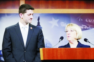 昨日,美国会众议院预算委员会主席保罗·瑞安(左)和参议院预算委员会主席帕蒂·默里宣布达成未来两个财年的联邦政府预算方案。如获得国会通过,将可避免明年1月15日再次出现政府关门风险。(详细报道见第8版)新华社/图