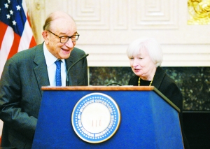 16日,美国首都华盛顿,史上任期最久的联邦储备委员会前主席格林斯潘(左)和即将成为美联储百年历史上首位女性主席的耶伦共同参加了美联储成立100周年纪念活动。美国联邦储备系统依据美联邦储备法建立,该法案由美国前总统伍德罗·威尔逊签署生效,确定了美国联邦储备系统的基本框架。新华社/图