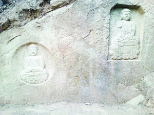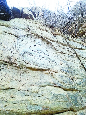 摩崖谷入口的指示牌指向一片山林深处,需手扶铁链护栏向陡峭的山上徐行。园中虽然热闹,但此处并无游客,只有扫帚清扫落叶的声音在空气中似近又远地传入耳中。举目四望,只有苍茫的山林,并不见人。大约攀爬了二三十分钟后,抬头见一尊佛像赫然显现,得见探寻的所在悠然“端坐”在高耸的山崖之上。上前细细端详,造像距岩顶不足20米,褐色麻石中央刻出一个高1米有余、宽约1米的佛龛。其中佛陀盘腿于莲花座上,身披通肩袈裟,卷发螺髻,双目下视,隆鼻大耳,面相方颐。成功探寻到石佛造型之一,不禁叫人精神为之一振。据相关专家介绍,石佛雕于明代嘉靖三十二年,距今已有500多年历史,共有三龛。于是继续向前探寻。