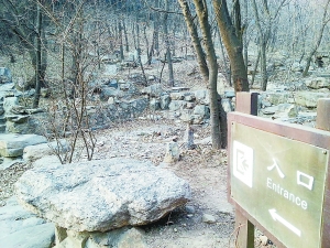 时值周末,八大处停车场内车辆停放得满满当当。一路上可见络绎的香客和不少负有登山装备的游人。据公园管理处的工作人员介绍,现在虽是旅游淡季,但每逢初一、十五,入园的日游客量可近万人。冬季的北京郊外空气清冷,望着山野之中的枯木,混合脚下簌簌的落叶声,平添了几分萧瑟之美。依照园内清晰的路牌指示,直奔八处证果寺的方向,就能到此番探寻的目的地——摩崖谷的所在。