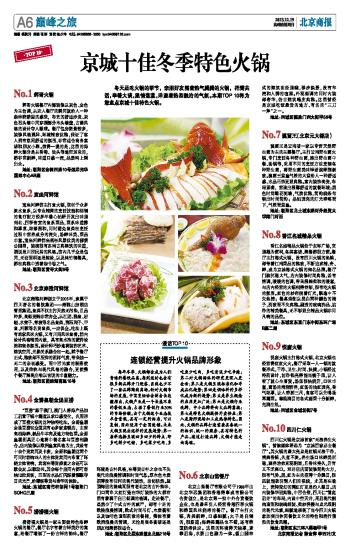 冬天是吃火锅的季节,亲朋好友围着热气腾腾的火锅,把臂共话,举箸大谈,温情荡漾,洋溢着热烈融洽的气氛。本期TOP 10将为您盘点京城十佳特色火锅。