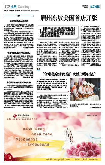 美国洛杉矶时间12月18日,眉州东坡集团的海外第一家餐厅——洛杉矶比佛利店正式开业。据悉,这家餐厅是眉州东坡与美国零售物业集团Westfield公司实行战略合作的形式在美国开店,开业当天的顾客来自明尼苏达、纽约、华盛顿和洛杉矶。