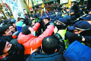 韩国铁路工会罢工到23日已持续15天,劳资双方仍未找到突破口,使铁路罢工愈演愈烈。22日,韩国政府投入警力抓捕铁路工会干部未果,引发工会和市民团体的激烈抗议。图为反政府示威者在首尔的工会联合会总部外举行集会,并与警方发生冲突。CFP/图