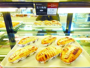 同样,该店出售的“海盗船”以及金凤成祥的芝士热狗等,均是将糕点托和糕点一起烘焙。交道口附近一家金凤成祥出售的芝士热狗,其溢出糕点托的部分竟然挂在了糕点托的外壁上;并且这种现象北京商报记者在农光里附近的金凤成祥也有发现。店面负责人员表示,这是由于糕点托和芝士热狗一起烤,糕点受热膨胀溢出遇冷后所致。