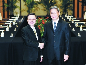 国务院台湾事务办公室主任张志军(右)昨日下午在南京与来访的台湾方面大陆委员会负责人王郁琦会面,就推进两岸关系有关问题广泛深入交换意见,并达成积极共识。新华社/图