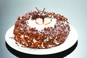 2.在巧克力蛋糕坯上薄薄抹上一层甜奶油,加一层黑车厘子