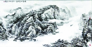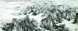 比如作品《霞光普照金山岭》,长城沿山脊建造,随山势蜿蜒曲折,忽高忽低、左右盘旋,奔腾于绵延起伏的奇峰峻岭之巅,大有一泻千里之势,尤为壮观。远处缭绕的云雾与近处的山石、绿树虚实相映所达到的柔与刚的对应,成为作品中明显的欣赏内容,技法的随意而为,穿梭在画面,疏密浓淡与云、雾、人、石、水共生境界,使得画面的山水语言富有逻辑性,具有整体感。这幅作品以水墨为主,在创作中特别用笔墨技巧将山石的纹理、结构充分表现,彰显北方山石的雄伟气势,整幅画肃穆悠远、画面饱满、意象新颖,呈现出独特的壮美情怀。