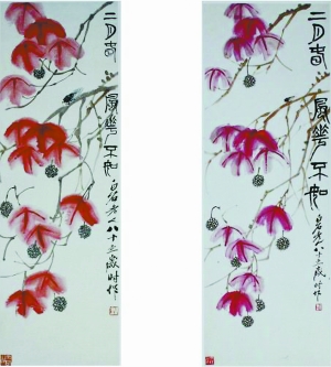 这两幅画相似度非常高,题款写着“二月春风花不如”,说的是火红色的枫叶,比花儿还要亮丽,意思非常好。上边加了一只工笔的蝉,蝉放在树枝上,取一个吉意,叫:“居高声自远,非是藉秋风。”这是唐代虞世南的诗句。