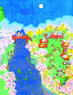 《春江花月夜》为黄永玉89岁时所作,画心高5米、宽3.85米。作品表现了唐代诗人张若虚《春江花月夜》诗中的情境,画面采用全景式构图,描绘了春江花月夜宴乐的盛景,能够让人们感受到黄永玉故乡凤凰沱江夜晚的感觉。此幅作品饱含深情,色彩浓烈,金碧辉煌;人物众多,造型生动,挥洒自如,综合了黄永玉在水墨和重彩方面的专长,是其80岁以后的最重要的代表作。