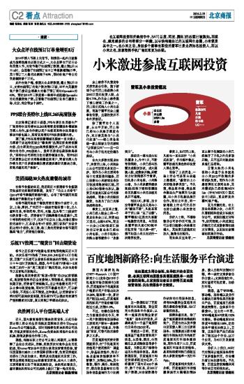 在互联网投资和并购战争中,BAT(百度、阿里、腾讯)的凶猛已被熟知。而现在,越来越多的公司希望分一杯羹,以尽快构建自己的互联网生态圈,小米便是其中之一。在小米之前,身挂多个董事长职位的雷军已是业界知名投资人,而以小米之名,这家智能手机厂商近来更为凶猛。