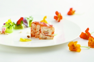 西班牙苯酒浸鹅肝加入多种中式香料,经14小时腌制,大理石纹理清晰可见,再配以大溪地的扶桑花与甜酒所制成的酱汁,口感细腻滑爽,色彩鲜艳夺目。甜菜根花园沙拉,由四种不同口味的甜菜根经由橙酒、橙汁及马达加斯加香草夹低温慢炖后,加入欢喜菊、海棠和三色堇,淡化了甜菜头泥土味的同时,还带来花朵天然的酸甜味道,清新爽口。水晶番茄冷汤配以樱桃番茄棉花糖、水波橄榄及欢喜菊,经提纯、冷冻得到清澈见底的番茄冷汤,加之更浓郁软绵的番茄棉花糖,细品之下,沁人心脾。北京商报记者 徐慧
