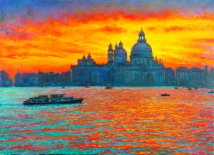 彭庆威走过很多地方,也游历过很多国家,他说自己爱极了那些看过的风景,总感到一支笔怎么画都画不够。在阿尔卑斯山下,他的雪山很静,但却在阳光的笼罩下泛着神圣的金色,好似与天堂咫尺天涯;在法国的田园,红色的屋顶与绿得已经不似人间的草地互相映衬,让人有着踏过草地探寻房屋的冲动;在威尼斯,一艘载客的游船在夕阳中缓缓驶过岸边的教堂,画面外的我们仿佛听到水划过船舷的拍打声与远处教堂的敲钟相鸣相和。