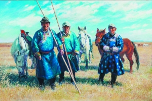 而彭庆威最为迷恋的是内蒙古的大草原,他用满满的爱把那里看到的一切都变成了画。于是,普通的牧民放马,在他的画中我们感到了微风过后留在他们脸上的闲逸,也看到了日落前返回帐篷时的一丝疲惫。在这一系列中,天地仿佛更加宽阔了,而人和牛羊的那份惺惺相惜早已跳出作品,向观者扑面而来,看得让人流泪。