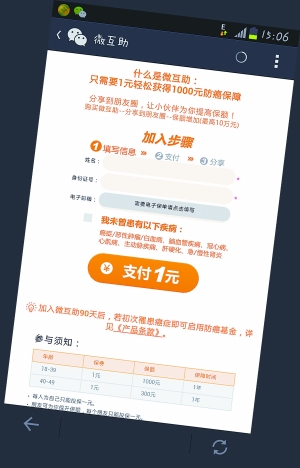 据了解,泰康人寿的“微互助”短期防癌健康险保费只有1元,被保险人年龄为18-49岁,保险期间为一年。投保的具体操作方式为,微信用户关注“泰康在线”微信公众账号并购买“微互助”防癌险产品后,可以将支付成功后生成的“求关爱”保单页面分享至微信朋友圈,而朋友圈的好友只需使用微信支付1元,便可将该保单的保额增加1000元。其中,被保险人在18-39岁,1元保费可以获得1000元保额,被保险人在40-49岁时,1元保费可以获得300元保额。