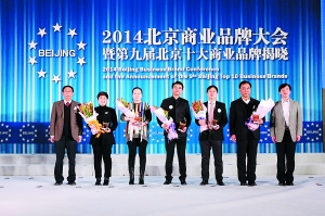 北京市社会科学院副院长周航(左一)、北京晨报社总编辑谢星文(右一)为2013年度北京商业业态创新品牌企业代表颁奖并合影