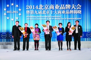 北京市商业联合会副会长高波(左一)、北京娱乐信报社社长梁凤鸣(右一)为2013年度北京商业文化创新品牌企业代表颁奖并合影