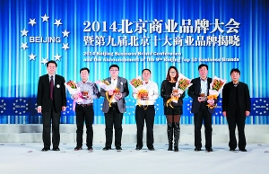 北京财贸职业学院院长王成荣(左一)、中国商报社社长范识宇(右一)为2013年度北京商业营销创新品牌企业代表颁奖并合影
