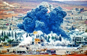 11月17日,叙利亚边境重镇艾因阿拉伯在空袭后冒起浓烟。叙人权观察组织11月9日说,邻近土耳其的叙北部重镇艾因阿拉伯战事持续至今,已造成超过1000人死亡。