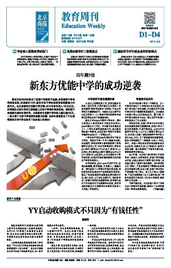 新东方在2008年推出了优能中学教育子品牌,全面推进中学全科培训业务。但直到2010年,新东方在中学生培训市场的影响力仍然不大。以北京新东方优能中学为例,2010年全年收入1亿元左右,而同期在北京已有好几家规模上亿的中学课外培训机构。然而接下来短短不到四年的时间,北京新东方优能中学年收入额已超5亿元,一跃占领了北京中学培训市场最大份额,这四年到底发生了什么使得新东方的中学业务有了如此惊人的增长?