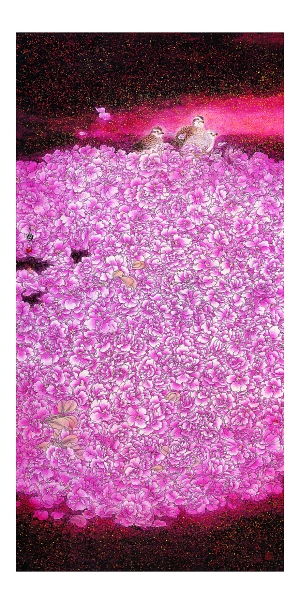 王云善于将复杂的绘画语言提纯化,把色彩的视觉张力扩大化,把情感承载的力量物质化。经过多年的不懈探索,王云现在的作品画面更加简洁、更加明丽、更加丰富而精炼。以往清晰的多层空间被压缩在一起,春花、飞禽等物象被意象性地重新编排,基于以往用心的布白也被舍弃,云、水、天空被大片的水墨晕染所代替。这是王云在当今开放的文化语境中所带来的更加自由广阔的探索语义。