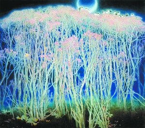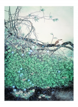 王云的花鸟画题材是常见的,没有陌生的奇花异鸟。他的画法也是传统的工笔设色和水墨晕染,技巧或来自前人,或略参西法,甚至艺术语汇也是融合中西者用过的。然而只要你面对他的画,就顾不得审视其艺术语言,思考其艺术技巧,而是被那标新立异的构图、如真似幻的画面、明快温馨的意境所打动、吸引。