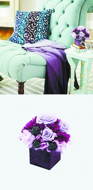 紫色是由温暖的红色和冷静的蓝色混合而成,它代表权威、声望、深刻和精神,是讨喜的颜色。紫色的蜡杯永生花,配合逼真的小桑果,真是冬季里的一抹温暖和悦目。