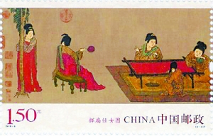 1984年3月24日,我国发行了T89《中国绘画·唐·簪花仕女图》特种邮票一套3枚、小型张1枚,就采用的是唐代著名画家周昉的原作。