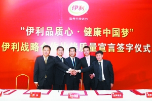 2014年2月,一场名为“伊利品质心·健康中国梦”的誓师大会在“乳业之都”呼和浩特拉开了伊利年度品质建设的序幕。其携手利乐、康美、杜邦、迪士尼等近百家供应商、零售商、经销商和原奶供应商代表及全产业链合作伙伴,共同签署了《伊利集团合作伙伴质量宣言》。
