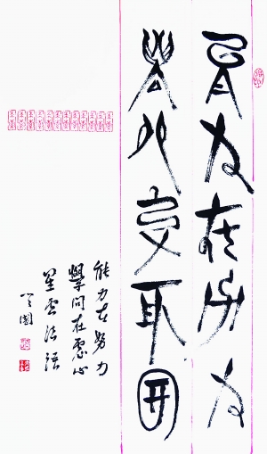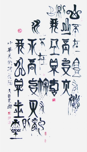 所谓不破不立。王天国表示,用毛笔书写水文,已经迈出了可喜的一步。“如何将水文带进中国的书法艺术世界,这就需要我们这一代人恭敬地、大胆地把水书请下神坛,探索水文书法艺术。”据记载,在汉文字中,古汉文字书写与汉字书法艺术的区别应该是“篆变”,“篆变”是汉字古今书写和书法艺术的分水岭。在汉文字发展中,自甲骨文、石鼓文后,相继出现篆、隶、草、楷、行等书体,而秦代李斯的大小篆则成为宫廷整理文字的标准版本。所以,文字学家和书法家都一直将篆书的出现作为古汉字书写与书法艺术的分界线。