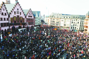 18日,示威者聚集在德国法兰克福罗马广场游行示威。因对现行欧元区财政政策和货币政策不满,法兰克福市东部的欧洲央行新址附近当日发生示威游行。示威者与警方发生冲突,已造成逾百人受伤、约500人被捕。新华社/图