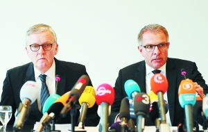 昨日,法国检察部门官员说,德国之翼客机坠机时,副驾驶员单独待在驾驶舱里,是他启动了客机降落过程,可以认为副驾驶员具有故意摧毁飞机的意图。德国汉莎CEO卡斯滕斯·施珀尔(右)在新闻发布会上证实了这一说法,并表示副驾驶驾机撞山的动机不明。新华社/图
