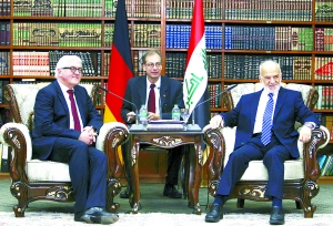 7日,在伊拉克首都巴格达,伊拉克外长贾法里(右)会见到访的德国外长施泰因迈尔(左)。贾法里7日在巴格达说,滞留在伊拉克境内的土耳其部队应在9日前撤出。一支营级规模的土耳其装甲部队近日越境进入伊拉克,部署在被极端组织“伊斯兰国”占领的伊第二大城市摩苏尔附近。伊拉克总统和总理5日先后发表声明,指责土耳其部队在没有得到伊中央政府邀请或授权的情况下进入伊拉克,并要求土耳其立即撤回该部队。新华社/图