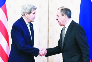 15日,在俄罗斯首都莫斯科,俄罗斯外长拉夫罗夫(右)与来访的美国国务卿克里握手。克里15日抵达俄罗斯首都莫斯科,与俄罗斯外长拉夫罗夫举行会谈,寻求在解决叙利亚危机和乌克兰问题上进行合作。这是克里今年第二次访俄。新华社/图