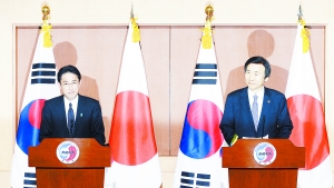 28日,韩国外交部长官尹炳世(右)与日本外相岸田文雄在韩国首尔举行记者会。尹炳世当日与到访的日本外相岸田文雄在首尔就日军慰安妇问题举行会谈并达成一致意见。尹炳世表示,如果日方能切实履行做出的承诺,韩方将确认慰安妇问题终结。新华社/图