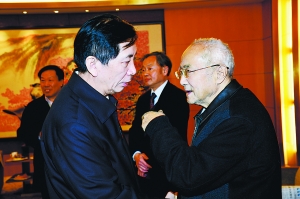 中国烹饪协会会长姜俊贤(左)与学界泰斗黄国雄会前交流