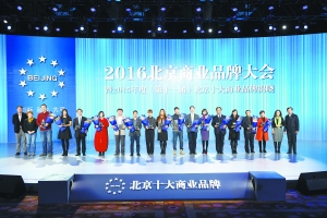 荣获2015年度北京商业营销创新品牌、管理创新品牌、文化创新品牌的获奖企业代表上台领奖并合影。颁奖嘉宾为,中国烹饪协会会长姜俊贤(右一)、北京市老龄办常务副主任王小娥(右二)、北京广播人民电台台长席伟航(左一)、首都建设报社长赵红(左二)。获奖嘉宾为,1919酒类直供北京地区公司合伙人兼总经理张建华(左三)、城外诚副总经理刘洋(左四)、北京首都机场商贸有限公司副总经理周立(左五)、蜜芽副总裁付娆(左六)、御食园总经理王大宝(左七)、红星商业副总经理刘建安(左八)、汉光百货总经理浦嘉嘉(左九)、北京建材经贸大厦总经理张红(左十)、万家灯火总经理张晶(右九)、华润五彩城副总经理任东亮(右八)、华润凤凰汇购物中心总经理黄持(右七)、家和家美总裁田耘(右六)、来福士购物中心总经理马莎(右五)、南新仓总经理王双文(右四)、洋码头公关总监陈颖(右三)。