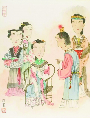 马小娟的《红楼梦》图在创意、构思和构图方面都注重于气局流走,疏密有致,以空灵自如为追求。其着眼点并不在具体地描摹原著的环境场景,而是以刻画人物、抒情写意为主。因此画中的空白布势,气息平和,变化多姿,绝无壅塞沉闷之感,令人赏心悦目。
