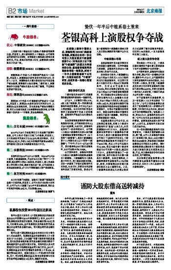 在查阅此前的公司公告后,北京商报记者发现,实际上中植系与荃银高科的“恩怨”由来已久。时间回溯到2014年7月10日,荃银高科董事长张琴曾与中新融泽执行事务合伙人重庆中新融创投资有限公司签订了《战略合作协议》,中新融泽拟收购荃银高科的股份不少于2000万股,约占上市公司总股本的12.36%,而这也意味着中植系有望成为公司的第一大股东。随后在7月21日,荃银高科曾推出了一份定增方案,发行对象则为归属中植系的中新融泽,如果定增完成,中新融泽将持有荃银高科4.17%的股份。然而,未曾想到这份定增方案却在股东大会上遭到否决。之后,中新融泽虽然通过几次受让股权的方式获得了部分荃银高科股份,但仅有7.9%的股权,一直为荃银高科的第三大股东。