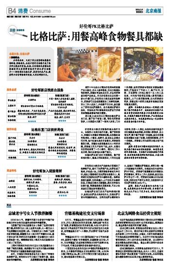 比格比萨东直门店的产品种类相对较少,还是以比萨及水果沙拉为主,但是比萨方面也有创新和改良,这里的比萨以薄饼类为主,还推出了榴莲比萨等新品,经常出现一端上台就被抢光的情况。比格还在店内设有比萨DIY专区,消费者可根据需求自行搭配比萨所需食材,再交由工作人员烘烤。该店的比萨只有12寸一种,消费者若选择DIY则必须吃完,若实在吃不完可以带走,但是要另外支付比萨的费用(59元/个)。