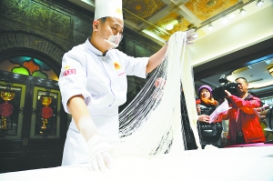 据了解,现场抻成的龙须面是制作国际金奖特色面点全聚德龙须饼的主要原料。龙须饼由龙须面发展而来,面条细如发丝,油炸后犹如交织在一起的龙须,加入绵软的奶油忌廉,香甜可口、入口即碎,是一道中西合璧的佳肴。抻面是面案绝活之一,全凭厨师一双巧手,用500克左右的干面粉,经过和面、醒面、溜面,最后抻好的面丝可以轻松地穿过缝衣针的针眼。面条经过13次抻拉形成8192根面丝,而全聚德的厨师最多可以将面条折合15次,形成32768根面丝,总长度超过5万米,相当于5.6个珠峰的高度。