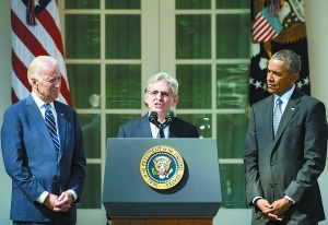 3月16日,在美国华盛顿白宫,哥伦比亚特区上诉法院大法官梅里克·加兰(中)发表讲话,美国总统奥巴马(右)与副总统拜登在一旁聆听。
