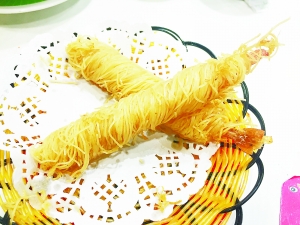 池田回转寿司的三文鱼因为没有冰镇,口感还有待提升,但用材比较新鲜,仍然很受消费者喜欢。金丝虾外裹金黄酥脆的丝条,内里是鲜嫩的虾仁,不管是卖相还是口感都很不错,南瓜糕口感细腻,且甜而不腻,也是池田比较受欢迎的甜品。