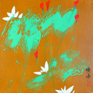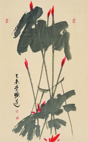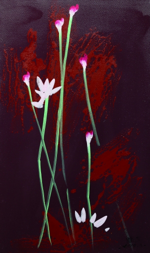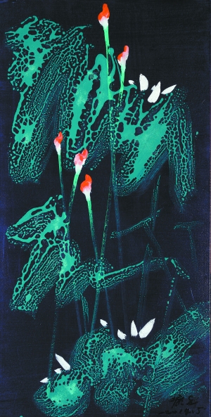 一定是参禅悟道的因素使得他将佛教中的桃红颜色一尘不染地施于画布上,演绎出一朵朵形态各异、婀娜多姿的艳荷。这荷葩与荷朵开苞绽放的如美丽艳妇,含苞待放的似妙龄少女。而那一个个如蝌蚪般游动的朵蕾竟然活似一个个企图创造生命的精子,充满活力地为生命的延续而竞争。