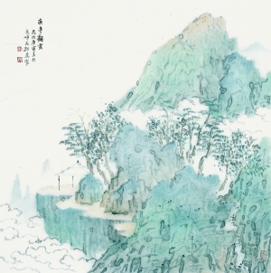 对此,邵连表示,在色彩的处理上,降低颜色饱和度,采用淡彩渲染的方法,使颜色在有形而又不拘于形限制的自然渗化中与笔墨相互溶合,产生出一种自然、典雅、含蓄的艺术效果。这样处理既保持了青绿山水特有的高华气象,又散发出水墨山水特有的淡泊与空灵的气息。