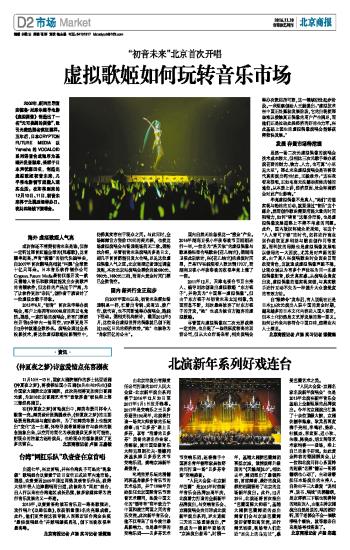 2015年6月,“初音”首次来华举办演唱会,落户上海拥有6000坐席的风云电竞馆。据悉,一连四场的演唱会,所有门票都在开售8分钟内一抢而空,VIP票更是不出2分钟就遭全数秒杀。演唱会通过全系投影技术,将这位虚拟歌姬投影到空中,仿佛真实存在于观众之间。与此同时,全场挥舞官方售价170元的荧光棒,也使这场虚拟演唱会与普通现场别无二致。据粉丝介绍,尽管初音未来演唱的多是日文,却几乎首首都能引发大合唱,足见这位虚拟偶像人气之旺。北京商报记者通过调查发现,本次北京站演唱会票价共设680元、980元、1480元三档,而周六黄金时间门票已全数售空。