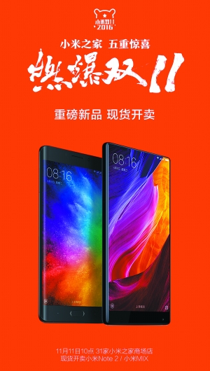 小米在线下的直营零售店准备了五重惊喜:全国31家小米之家商场店将于“双11”当天10点,正式现货开卖小米Note 2亮黑版与小米MIX两款重量级新品手机。用户持本人身份证原件到店排队领取号牌后即可参与现货购买。