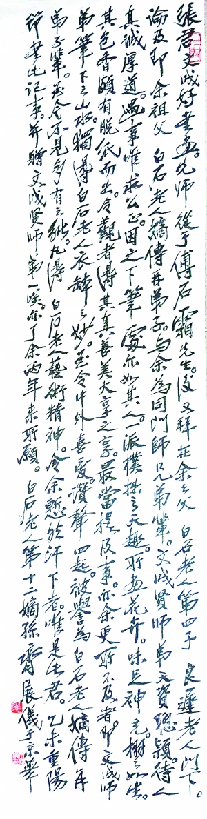 张文成是齐白石老人弟子傅石霜先生和白石老人四子齐良迟先生的得意门生。多年来,张文成在继承齐派绘画艺术笔墨基础上,独辟蹊径,大胆创新,所作的花鸟、山水,浑厚大气,格调高雅。老师傅石霜先生称赞其:“窗外瑟瑟已秋风,废纸三千业已成,得失本是身外事,能凭翰墨寄真情。”如今,张文成已成为齐派绘画有着杰出造诣的第三代艺术传人。