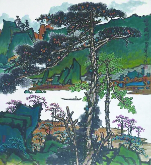 陈晚村擅长山水画创作,主攻山水、松树,以青绿重彩为主要表现方法,每幅山水作品都需要经过几十次的反复润色润墨,从而使画面更加充满生命力,作品布局严谨,工笔与写意相结合,气势磅礴。与此同时,他通过“师法古人”,从深厚的中国传统文化中积累了扎实的笔墨功底,他深谙中国文化“以简驭繁”的精要,通过简练的画笔表达内涵丰富的意韵。